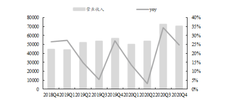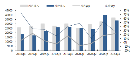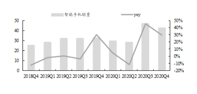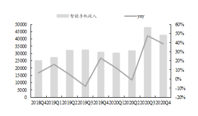 驱动营业收入快速增长的核心动力来自手机业务的高速增长,本季度智能手机业务收入同比增长38%至426亿元,依然保持快速增长。其中手机销量因缺货影响,同比增长30%至42百万部,是驱动收入快速增长的主要因素,其中大陆市场同比增长52%,在前五大智能手机厂商中增长最快,市占率由2019Q4的9.2%上升至2020Q4的14.6%。