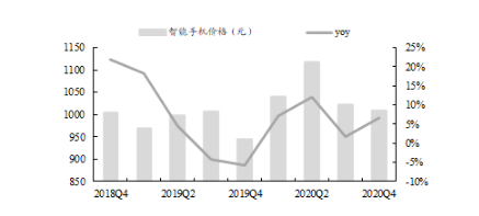 另外,产品高端化进展顺利,2020年销售的高端机型(单价高于3000元及300欧元)约1000万部,占全年手机销量的7%。高端化推动国内手机ASP明显提升,Q3同比提升7%至1009元,全年手机ASP为1040元,同比增长6%。