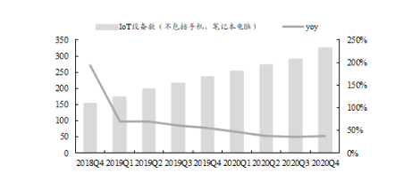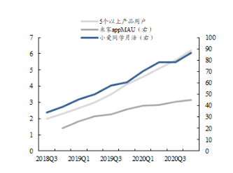 2020年Q4,IoT与生活消费产品业务收入为人民币211亿元,同比增长8%,同比增速放缓。IoT连接设备数达到3.25亿台,同比增长38%。同时,拥有5个以上IoT设备的用户达到620万新高,智能家居控制中心米家APP的月活也同比增长了22%至45百万,AI语音控制终端小爱同学月活达到87百万,同比增长44%。