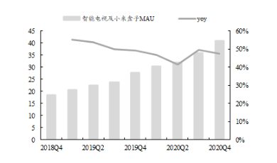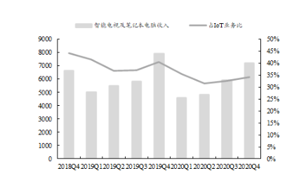 智能电视及笔记本电脑:占IoT业务收入比重最大的智能电视及笔记本电脑收入同比下跌10%,达到71亿元,占IoT业务收入比重为34%。受疫情影响,智能电视2020年全球出货量为12百万台,同比下降6%。公司智能电视及小米盒子MAU与电视存量相关度高,MAU依然在快速增长,本季度达到41百万,同比增长48%。