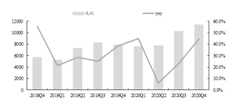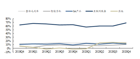 互联网服务分部毛利率由2019年第四季度的63.7%升至2020年第四季度的68.4%,主要是由于毛利率较高的广告业务收入佔比增高所致。