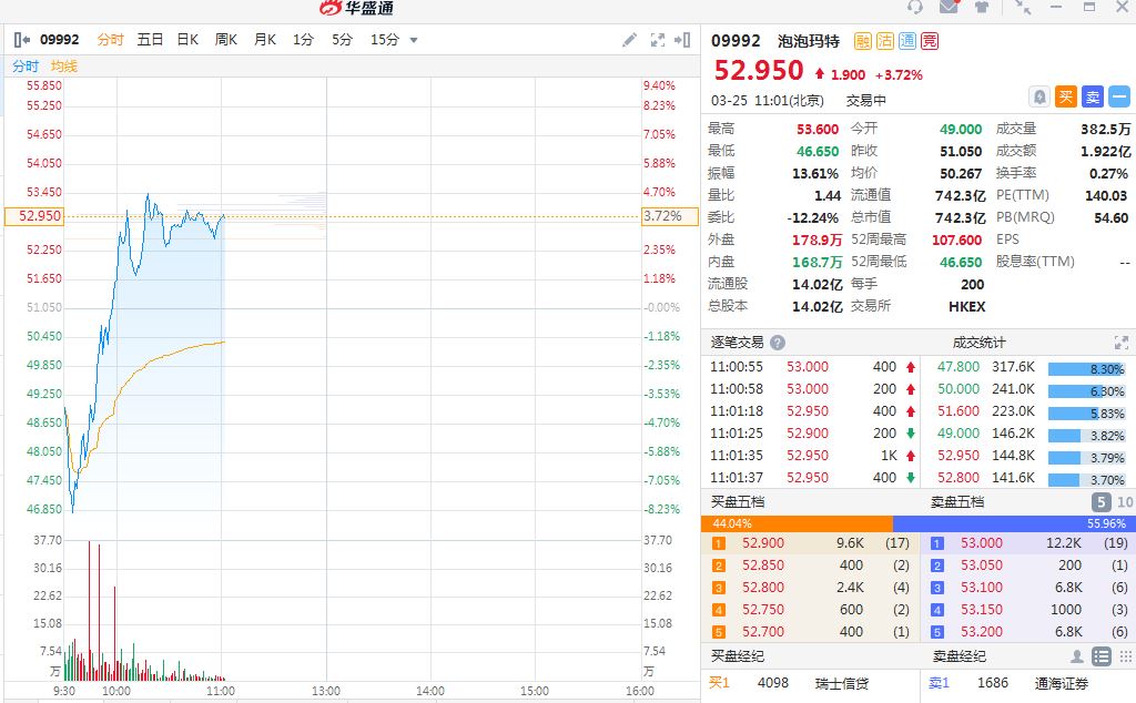 华盛资讯3月25日消息,今日开盘泡泡玛特快速跳水,盘中一度跌超8%,股价再创新低,报每股46.65港元,随后低开高走。截至发稿,泡泡玛特上涨3.72%,现报每股52.95港元,总市值742亿港元,盘中振幅超13%。该股此前已连跌5日。