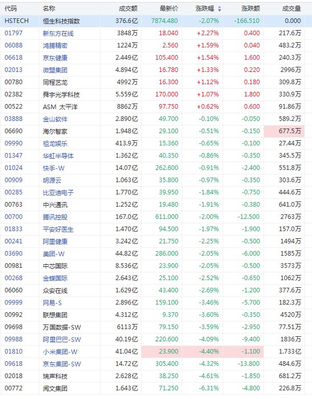小米、腾讯跌幅分别收窄至4.4%、2%。截至发稿,新东方在线涨超2%,京东健康、鸿腾精密涨超1%。阅文集团跌超6%,京东、阿里跌超4%,网易-S跌超3%。