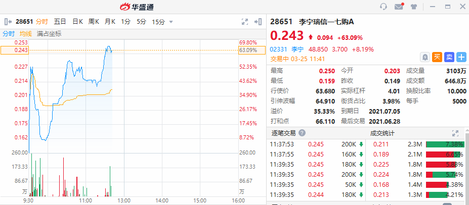 相关窝轮方面,李宁瑞信一七购A大涨超60%,成交额646.8万港元,其行使价为63.68港元,2021年7月5日到期,接货比为3.98%。