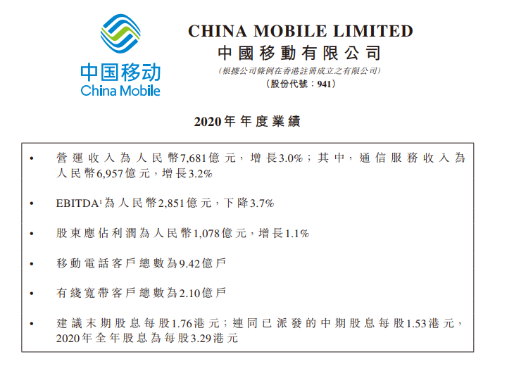 中国移动在港交所公布业绩报显示,2020年营运收入为7681亿元,增长3%;其中,通信服务收入为6957亿元,增长3.2%;EBITDA为2851亿元,下降3.7%;股东应占利润为1078亿元,增长1.1%;移动电话客户总数为9.42亿户,有线宽带客户总数为2.10亿户。建议末期股息每股1.76港元;连同已派发的中期股息每股1.53港元,2020年全年股息为每股3.29港元。