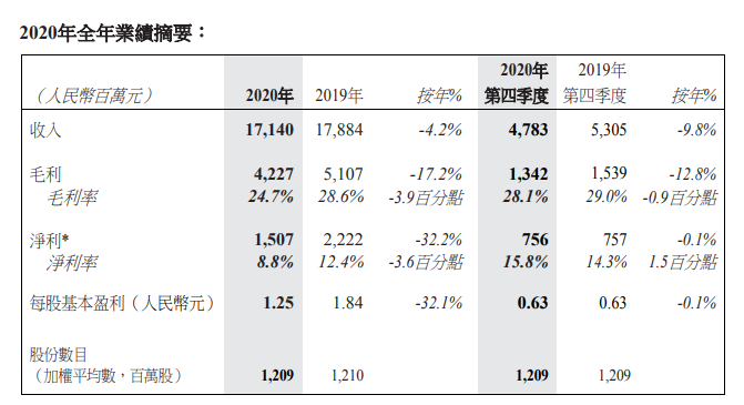 2020年第四季度总收入人民币47.8亿元,同比下跌9.8%,运营效率和成本控制的提升和产品组合的持续优化,推动本季度毛利率达到28.1%,环比改善4.5个百分点。第四季度,净利润实现人民币7.56亿元,季度环比提升75.7%,体现了良好的增长势头。