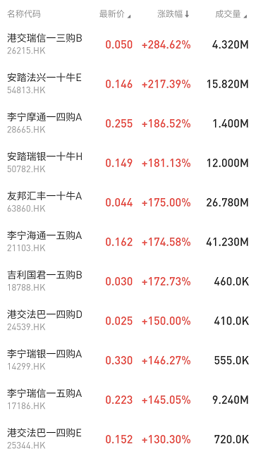 港交瑞信一三购B涨284.62%占据涨幅榜第一,但成交额不大。其次是安踏法兴一十牛E涨217.39%、李宁摩通一四购A涨186.52%。