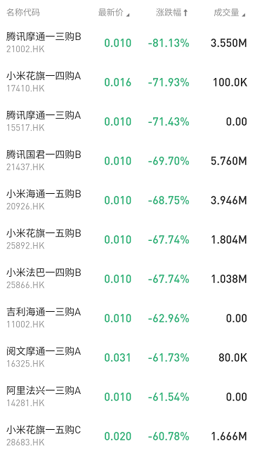 在今日跌幅榜中,腾讯摩通一三购B跌81.13%;小米花旗一四购A大跌71.93%。