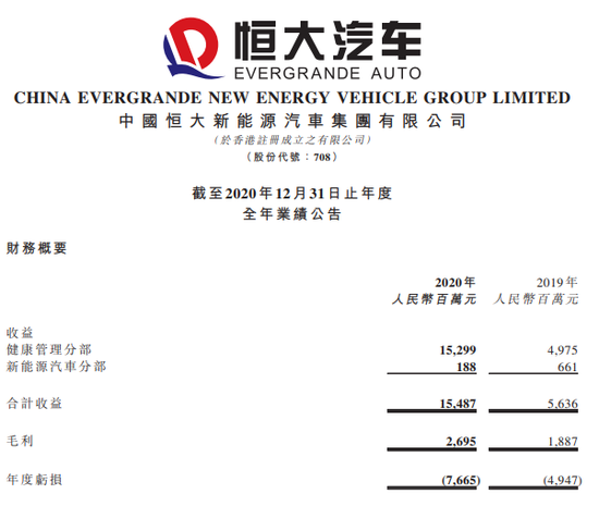 恒大汽车:2020年收益154.87亿元 年度亏损76.65亿元