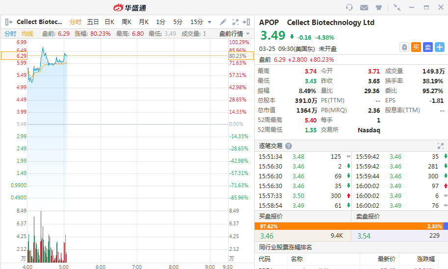 华盛资讯3月25日消息,美股盘前,多只个股大涨。其中Cellect Biotechnology(APOP)盘前涨幅扩大至80.23%,消息面上,公司宣布和Quoin Pharmaceuticals战略合并。