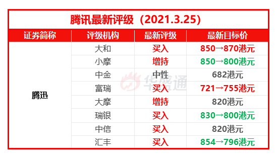 中金发布研究报告,公司去年四季度手游收入增长放缓,主要受到Supercell并表影响消失所致,今年尽管面临高基数,但受惠于公司稳健的产品矩阵,手游收入仍有望保持18-26%增速。该行小幅下调公司2021年非通用准则净利润预测3.8%,为新游戏上线时间的不确定性留出足够的缓冲。随着视频号、小程序等一整套微信生态体系产品逐渐成熟,判断腾讯在广告业务上后劲长足。