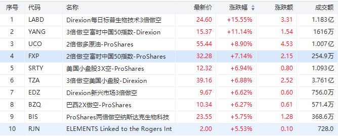从ETF涨幅榜来看,涨幅居前主要的ETF主要与做空中国、做多原油、做空生物技术等等的相关,其中一只做空生物技术的LABD大涨15.55%,上一交易日大涨17.36%,两日合计涨超30%,成交额1.18万美元;2做多原油的UCO涨8.90%,成交额1.01亿美元。