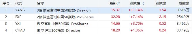 其中,3倍做空中国YANG大涨11.14%,成交额1616万美元;2倍做空中国FXP涨7.14%。