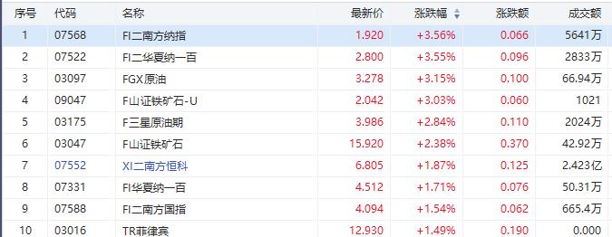 受苏伊士运河堵塞的影响,港股涨幅居前的ETF主要与原油、大宗商品等相关,其中FGX原油涨3.15%;F三星原油期涨2.84%,成交额2021万港元。