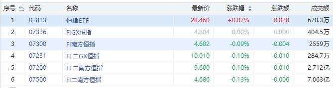 看多与看空恒相关ETF纷纷走弱,其中,南方两倍看多恒指(07200.HK)跌0.01%,成交额2.71亿港元;南方两倍看空恒指(07500.HK)跌0.13%,成交额7.06亿港元。