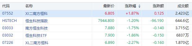 今日恒生科技指数跌1.2%。其中,南方两倍做多恒科(07226.HK)跌2.27%,成交额1.87亿港元;南方两倍做空恒科涨1.87%,成交额2.42亿港元。