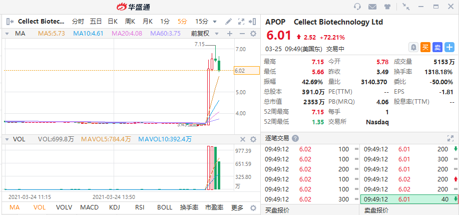 华盛资讯3月25日讯,美股盘初,以色列生物科技公司Cellect Biotechnology(APOP.O)走高,盘中涨幅一度超过100%,截至发稿,该股涨超72%,股价报6.01美元。