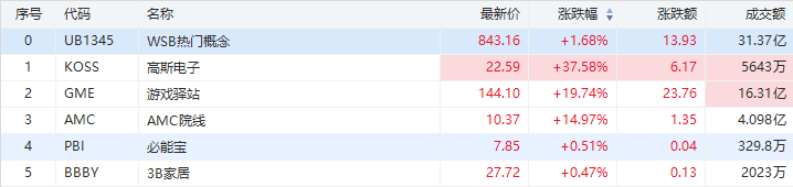 华盛资讯3月25日讯,美股早盘,WSB概念股涨幅扩大。截至发稿,高斯电子(KOSS.O)涨近38%,游戏驿站(GME.N)涨近20%,AMC院线(AMC.N)涨近15%。