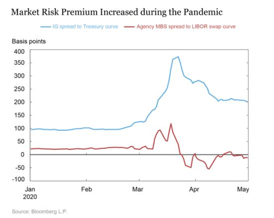 承担风险的成本增加可能会阻碍自营商建立更大的头寸。考虑市场风险溢价,即投资者承担风险(包括库存风险)所需的补偿。下图显示,机构MBS与伦敦银行间同业拆借利率(LIBOR)的利差在3月9日飙升(这是1997年以来首次触发市场熔断机制),并在3月第三周一直保持高位。爱尔兰政府债券与美国国债的息差稍早有所上升,但在3月23日见顶之前,也在3月9日飙升。这些结果表明,自营商承担库存风险的成本在3月份有所上升。
