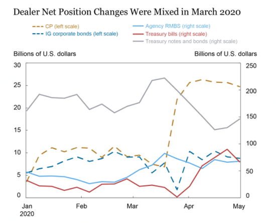 在商业票据市场和公司债券市场,有限的自营商中介和加剧的市场非流动性是齐头并进的,只有在美联储采取行动后才有所改善。例如,商业票据融资机制(CPFF)于3月17日宣布,该市场的自营商净头寸在3月25日当周恢复。同样,在3