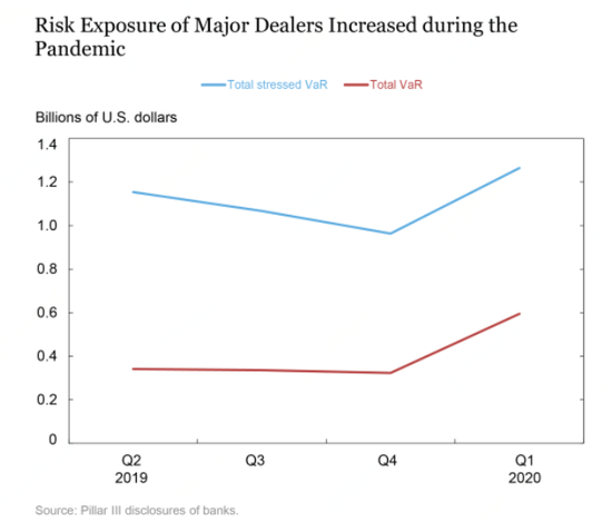 当自营商增加他们的净仓位时,这样做的成本也会上升。当市场波动剧烈时,这种库存风险就会增加。风险暴露的衡量标准是风险价值(VaR),它是在给定的置信水平上、给定的时间范围内的最大预期损失。由下图可以看出,五大自营商所关联银行的Average VaR和Stressed VaR在2020年第一季度大幅上升,表明风险敞口加大。