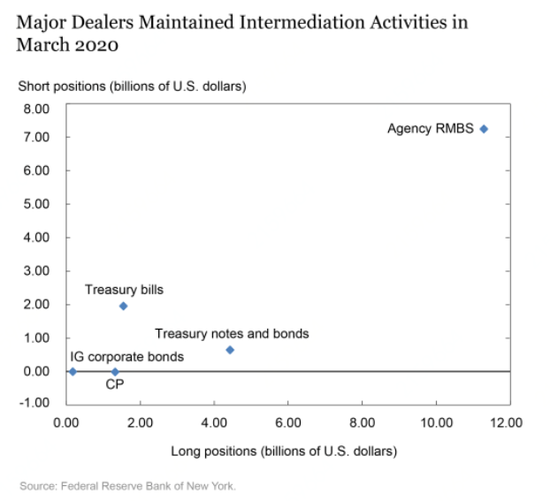 纽约联储利用构成总体自营商统计基础的微观数据,绘制了2020年3月在所有证券中占有重要市场份额的五大自营商的头寸的平均变化(见下图)。在票据、国库券、国债,以及机构RMBS市场,主要自营商在3月份合计增加或保持了净头寸。而在商业票据和投资级公司债券市场,总自营商净头寸在减少。