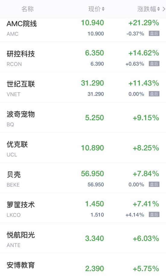 AMC院线涨超21%,波奇宠物涨超9%,贝壳、箩筐技术涨超7%,拼多多、荔枝、电子烟公司雾芯科技涨超2%,陆金所涨超2%,腾讯ADR涨0.79%。