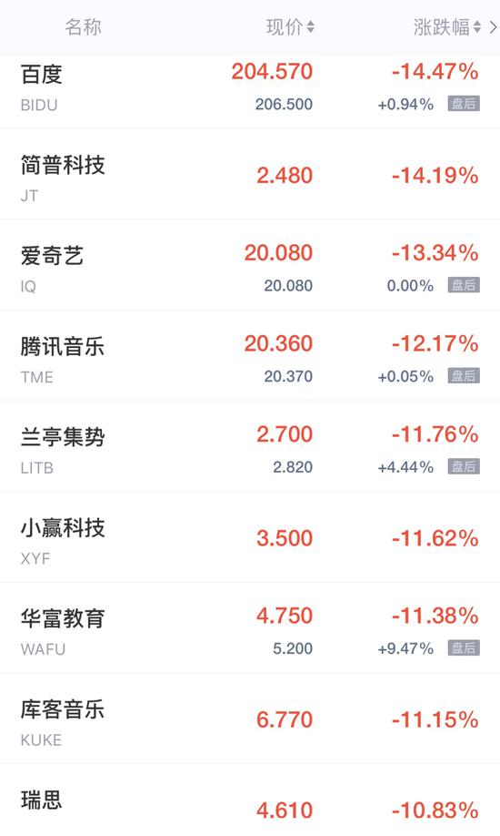 热门中概股周四收盘涨跌不一,几只热门中概股再度跌超10%,百度跌超14%,爱奇艺跌超13%,腾讯音乐跌超12%,唯品会跌超10%。斗鱼、YY>欢聚时代跌超3%,阿里巴巴跌近3%。