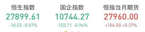 恒生指数开盘跌1.04%,早盘快速拉升,随后维持窄幅震荡。截至收盘,恒生指数跌18.53点或0.07%,报27899.61点,全日成交额达2004.79亿。国企指数跌0.96%,报10744.27点,红筹指数跌0.01%,报4065.02点。
