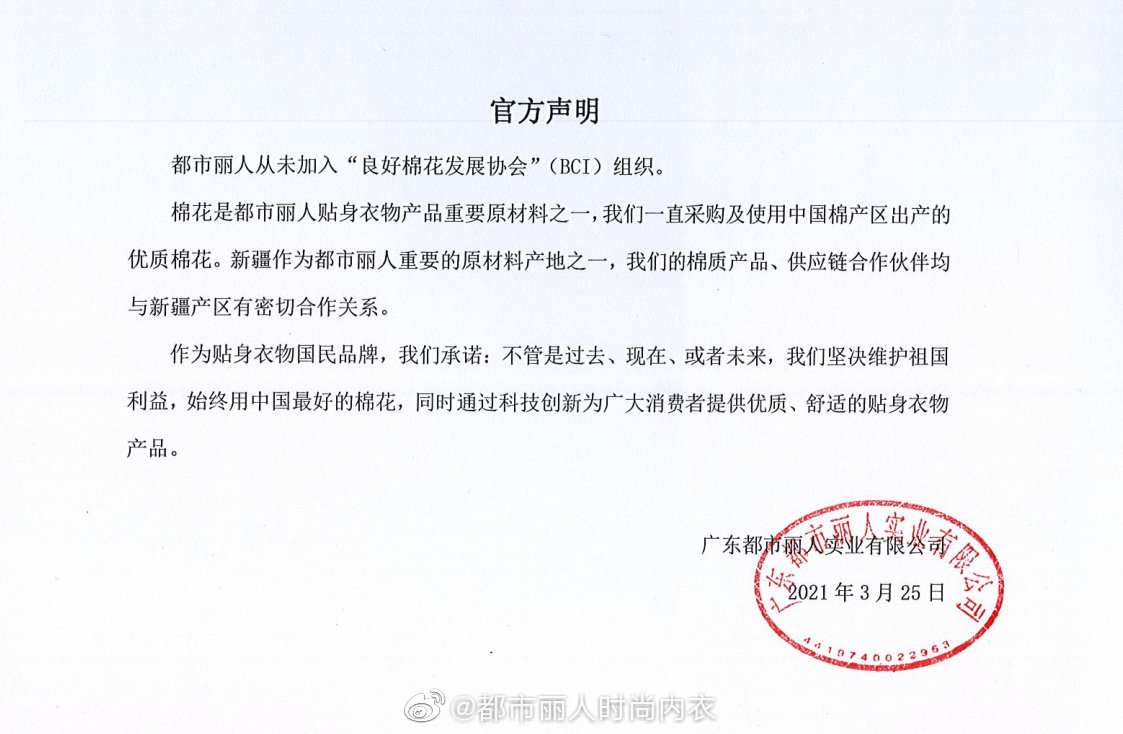 以“内衣第一股”的都市丽人为例,其发表从未加入“良好棉花发展协会”(BCI)组织。“都市丽人一直采购及使用中国棉产区出产的优质棉花。新疆作为都市丽人重要的原材料产地之一,我们的棉质产品、供应链合作伙伴均与新疆产区有密切合作关系。”