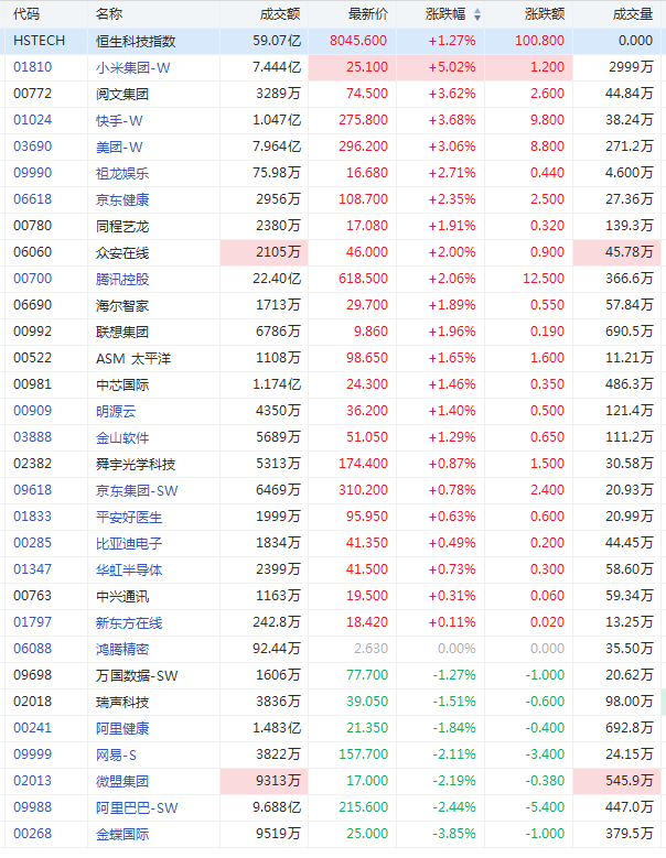 恒生科技指数涨1.27%,小米涨5%,美团、快手涨3%,腾讯涨2%。微盟、阿里巴巴跌2%。