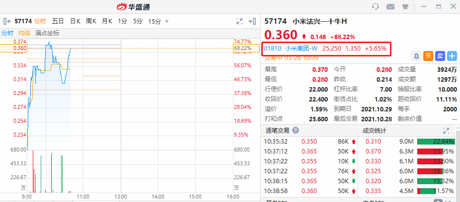 相关窝轮方面,小米法兴一十牛H大涨近70%,成交额1297万港元,其行使价为22港元,2021年10月29日到期,接货比为1.02%。