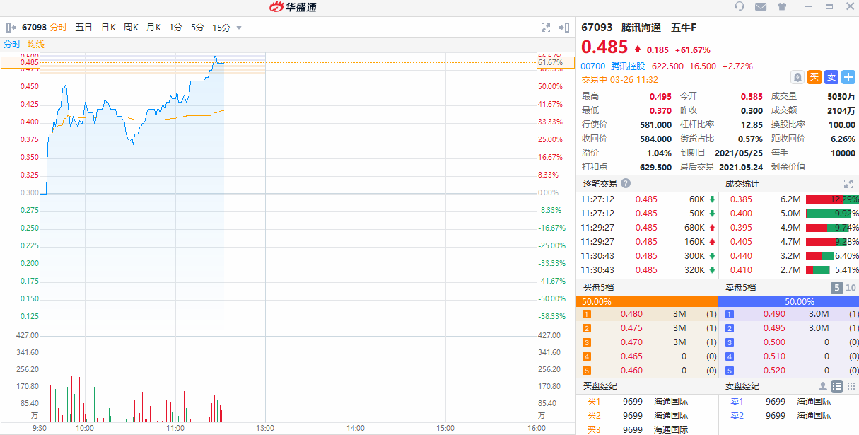 相关窝轮方面,腾讯海通—五牛F大涨60%,成交额2104万港元,其行使价为581港元,2021年5月25日到期,距现价有6.26%的收回距离。