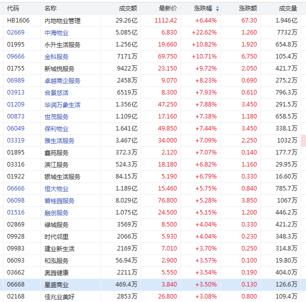 3月26日消息,内地物业管理股涨幅继续扩大,中海物业涨22%,金科服务、永升生活服务涨超10%,新城悦服务涨9%,世茂服务涨7%,保利物业、合景悠活涨7%。
