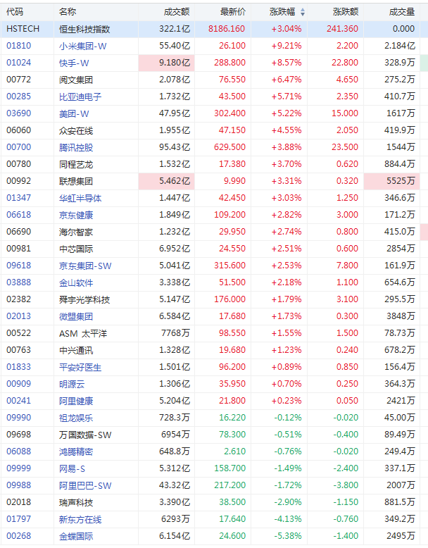 恒生科技指数大涨3% 小米涨超9%快手涨8%