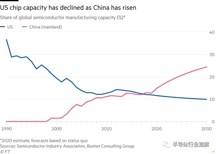 据英国金融时报报道,美国在全球芯片制造产能中所占的份额从1990年的37%下降到了2020年的12%,而欧洲在此期间下降了35个百分点,降至9%。中国大陆的市场份额从几乎没有扩大到15%,这一数字预计在未来十年将增长到24%。