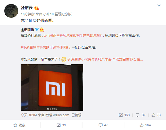 3月26日消息,小米短线走低,涨幅收窄至6.28%,针对“小米正与长城汽车谈判生产电动汽车,计划最快下周宣布合作”的消息,小米集团总办副主任、前小米集团公关部总经理徐洁云在微博表示,这是“完全扯淡的假新闻”。