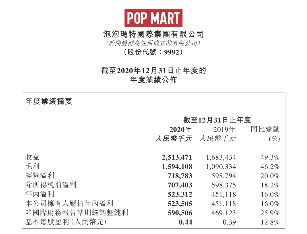 据2020年财报显示,泡泡玛特去年全年实现营收25.1亿元,同比增长49.3%。毛利15.94亿元,同比增长46.2%;经调整后净利润5.9亿元,同比增长25.9%。