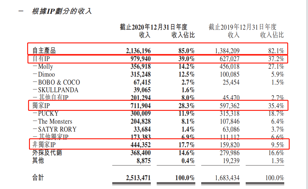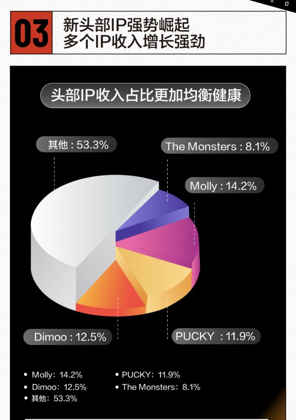 公司不断丰富IP类型、输出风格更为多样化的产品,在传统头部 IP Molly 和PUCKY 之余,另外两大IP也迎来成熟爆发期,销售数据liangyan占比不断攀升。头部IP保持强劲增长的同时收入占比更加均衡健康,在2020年其他IP的收入占比已达53.3%。