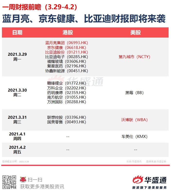 另外,下周也有多个重磅财报即将发布的,其中港股财报有蓝月亮、京东健康、比亚迪股份等;美股财报有:第九城市、黑莓、沃博联等。