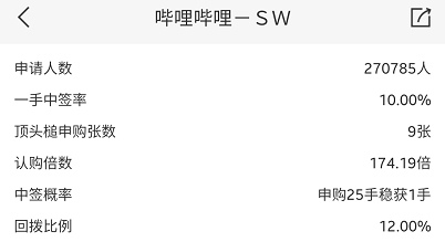 总认购人数270785人,137920人只认购1手(一手党),中签率10%,申请25手稳获1手。