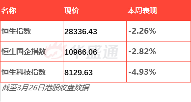 港股方面,恒生指数跌2.26%,报28336;恒生科技指数本周跌4.93%,报8129;国企指数本周跌2.82%,报10966。