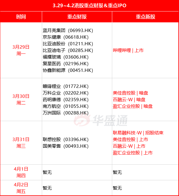 财报方面,港股重磅财报已在本周陆续揭晓,3月份最后几天还有蓝月亮、京东健康等发榜。