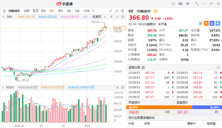 根据最新的财报显示,迪尔股份第一财季每股盈利3.87美元,超市场预期的2.14美元;营收也超预期。由于农业和建筑业的改善,该公司上调了全年盈利指引。