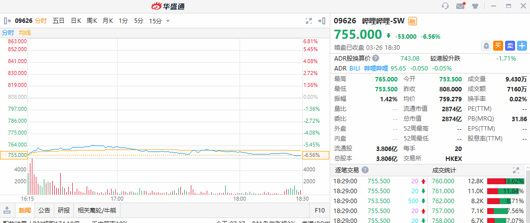 华盛资讯3月26日讯,哔哩哔哩-SW暗盘收报755.00港元,下跌6.56%,每手账面亏损1060港元。最新成交量7160万港元,最新总市值达2874亿港元。该股将于下周一正式上市。