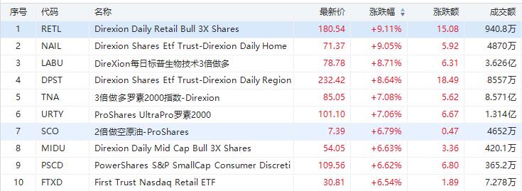 从ETF涨幅榜来看,涨幅居前主要的ETF是一只RETL的ETF大涨9.11%,成交额940.8万美元;其次是一只NAIL的ETF大涨9.05%,成交额4870万美元;还有每日标普生物技术3倍做多涨8.71%,成交额3.63亿美元。