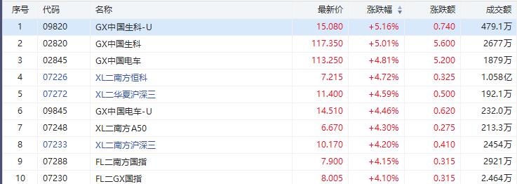 受消息影响,今日港股涨幅居前的ETF主要有GX中国生科涨5.01%,成交额2677万港元;GX中国电车涨4.81%,成交额1879万港元。