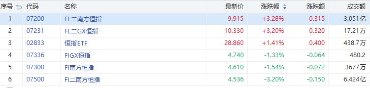 看多恒指的ETF走强,南方两倍看多恒指(07200.HK)涨3.28%,成交额3.05亿港元