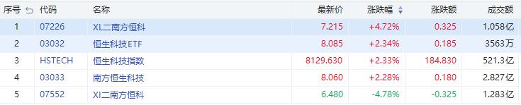今日恒生科技指数涨2.33%。其中,南方两倍做多恒科(07226.HK)涨4.72%,成交额1.06亿港元;南方两倍做空恒科跌4.78%,成交额1.28亿港元。
