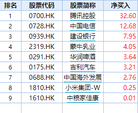 个股资金流向统计:南下资金扫货腾讯中国电信 加仓建设银行、蒙牛乳业